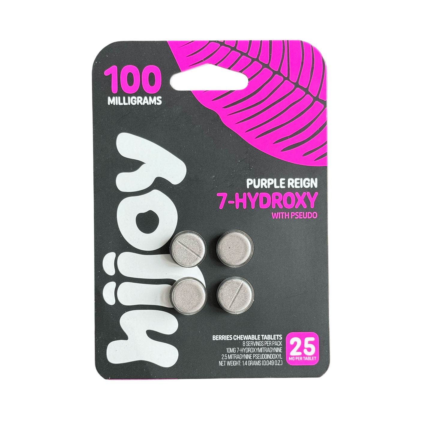 HiJoy Purple Reign tablets contained 15.85mg of combined 7-hydroxy and pseudo, which was about 37% weaker than its 25mg claim.