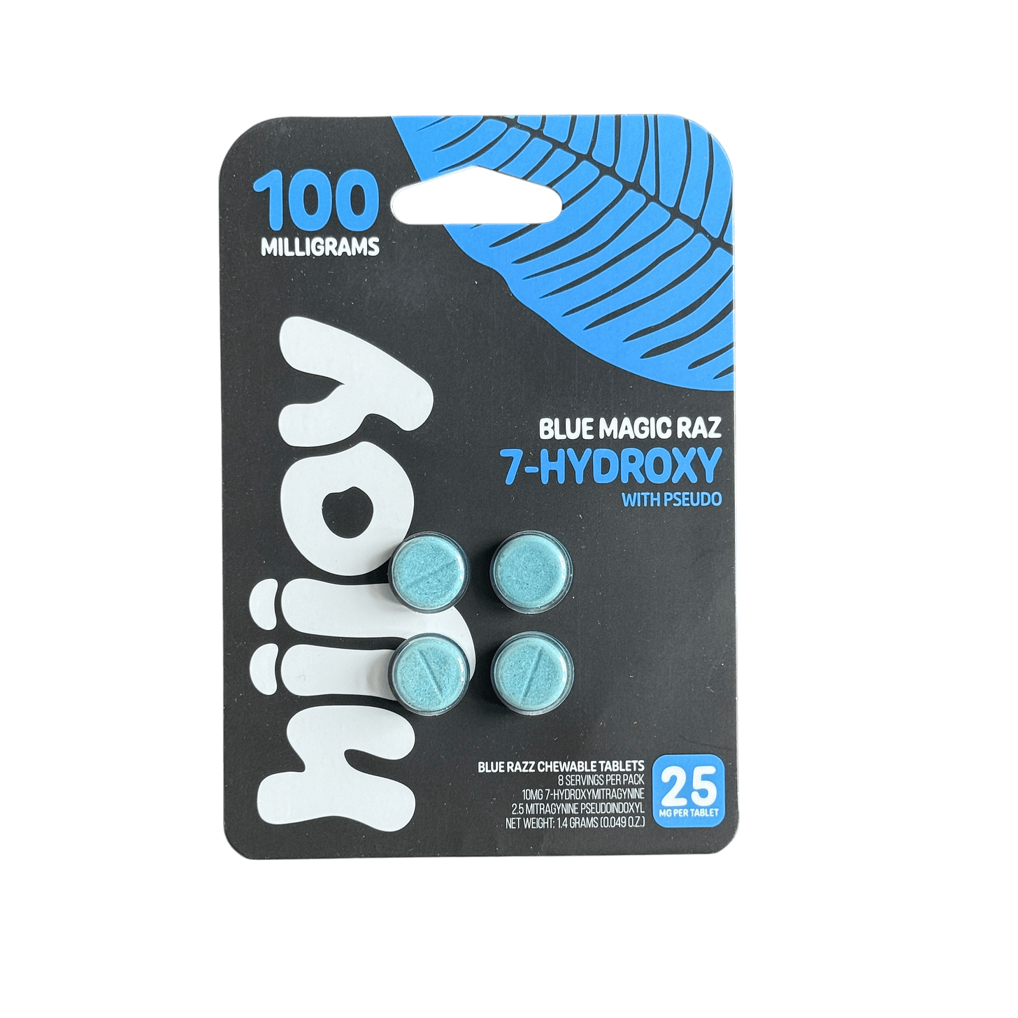 HiJoy Blue Magic Raz tablets contained 18.35mg of combined 7-hydroxy and pseudo, which was about 27% weaker than its 25mg claim.
