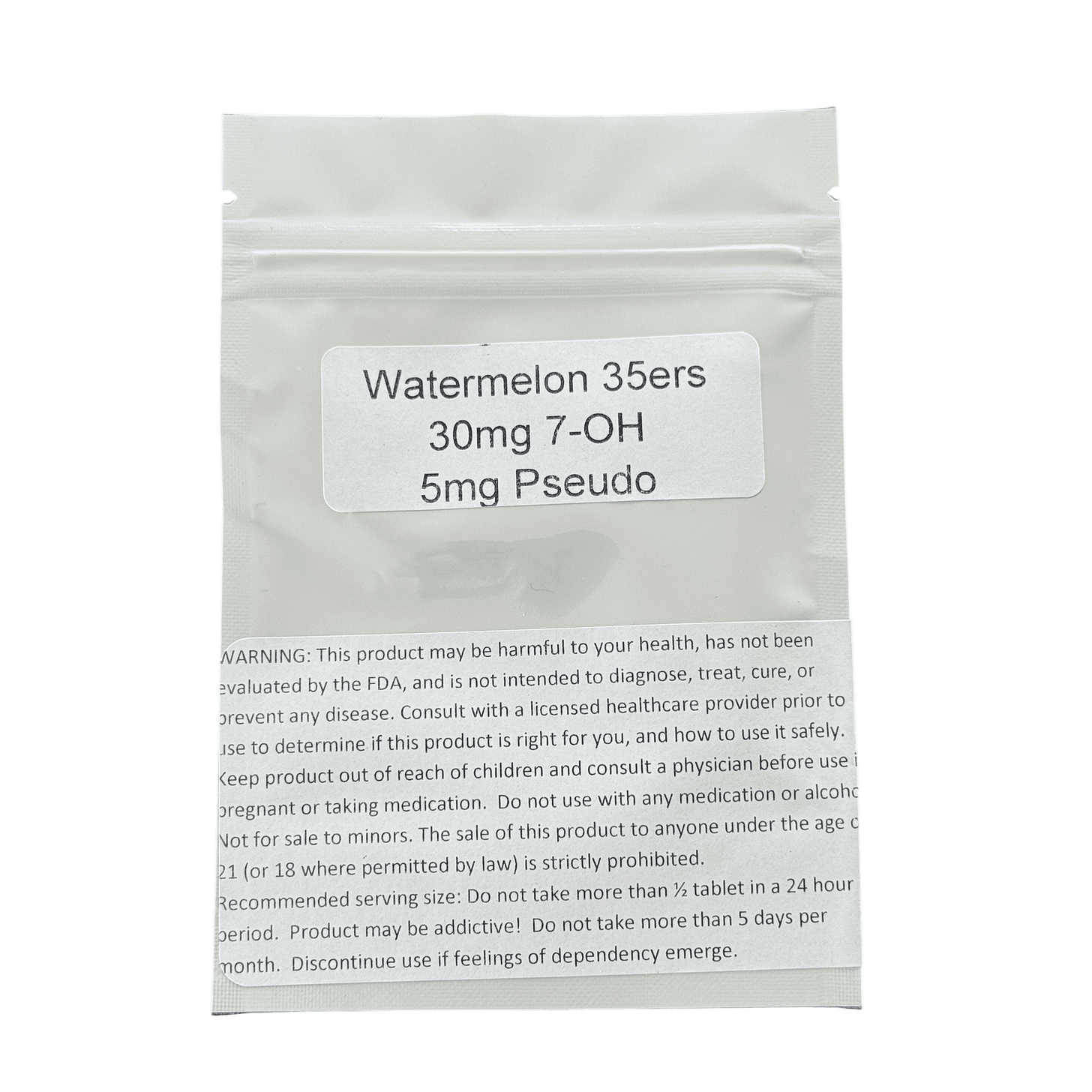 KD Watermelon 35er tablets backed up their potency claim. Each tablet contained 32.37mg of combined 7-OH and pseudo, which was slightly weaker than its 35mg claim.