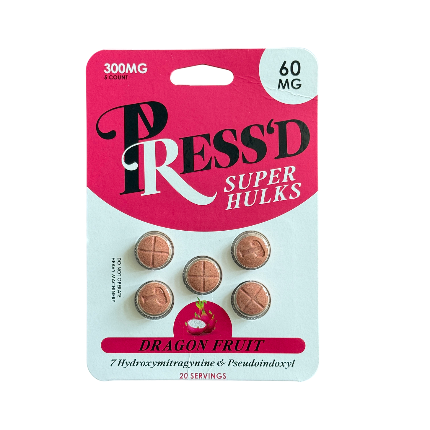 Press’d Dragon Fruit Super Hulks tablets contained 38.43mg of combined 7-hydroxy and pseudo, which was about 36% weaker than their 60mg claim.