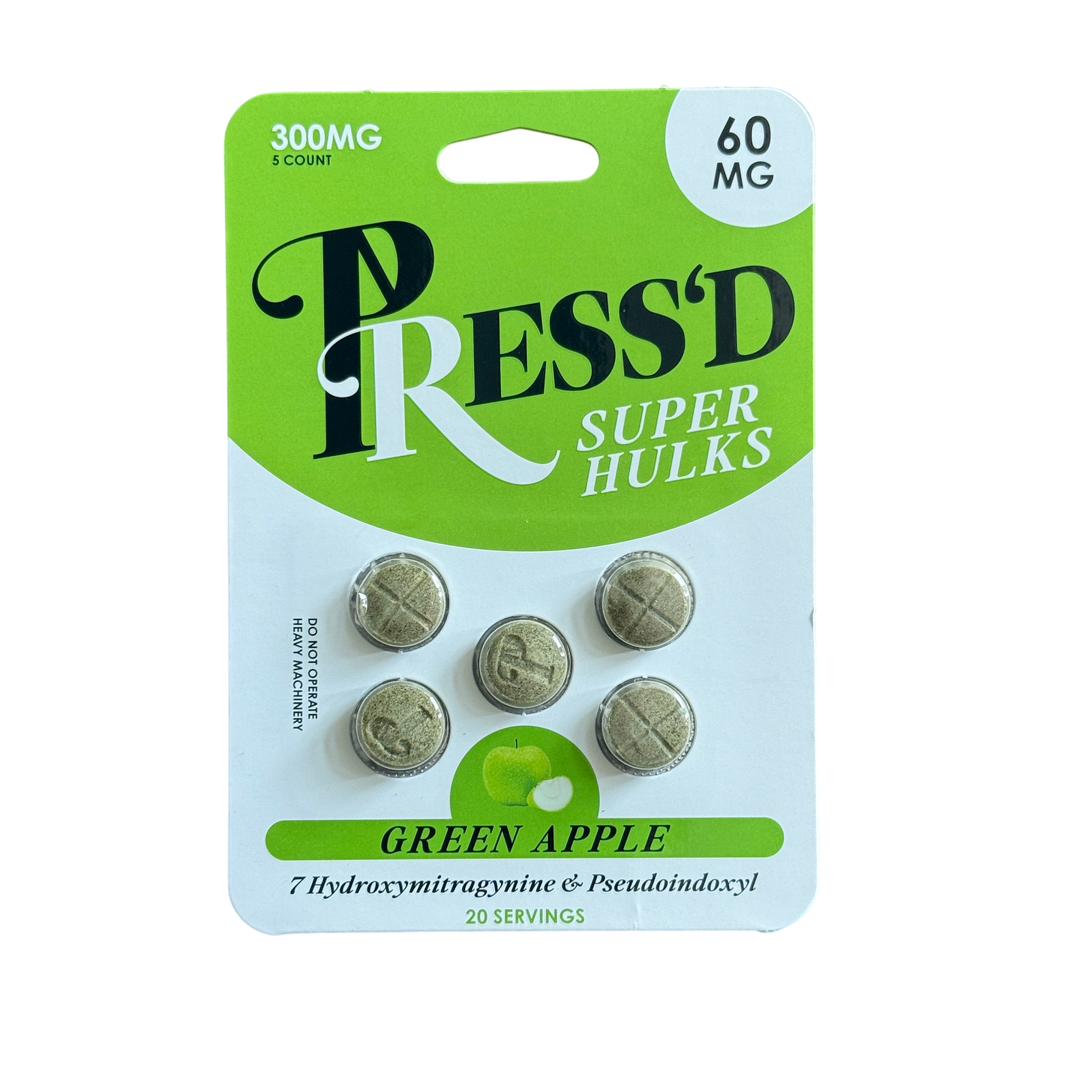 Press’d Green Apple Super Hulks tablets contained 36.78mg of combined 7-hydroxy and pseudo, which was about 39% weaker than their 60mg claim.