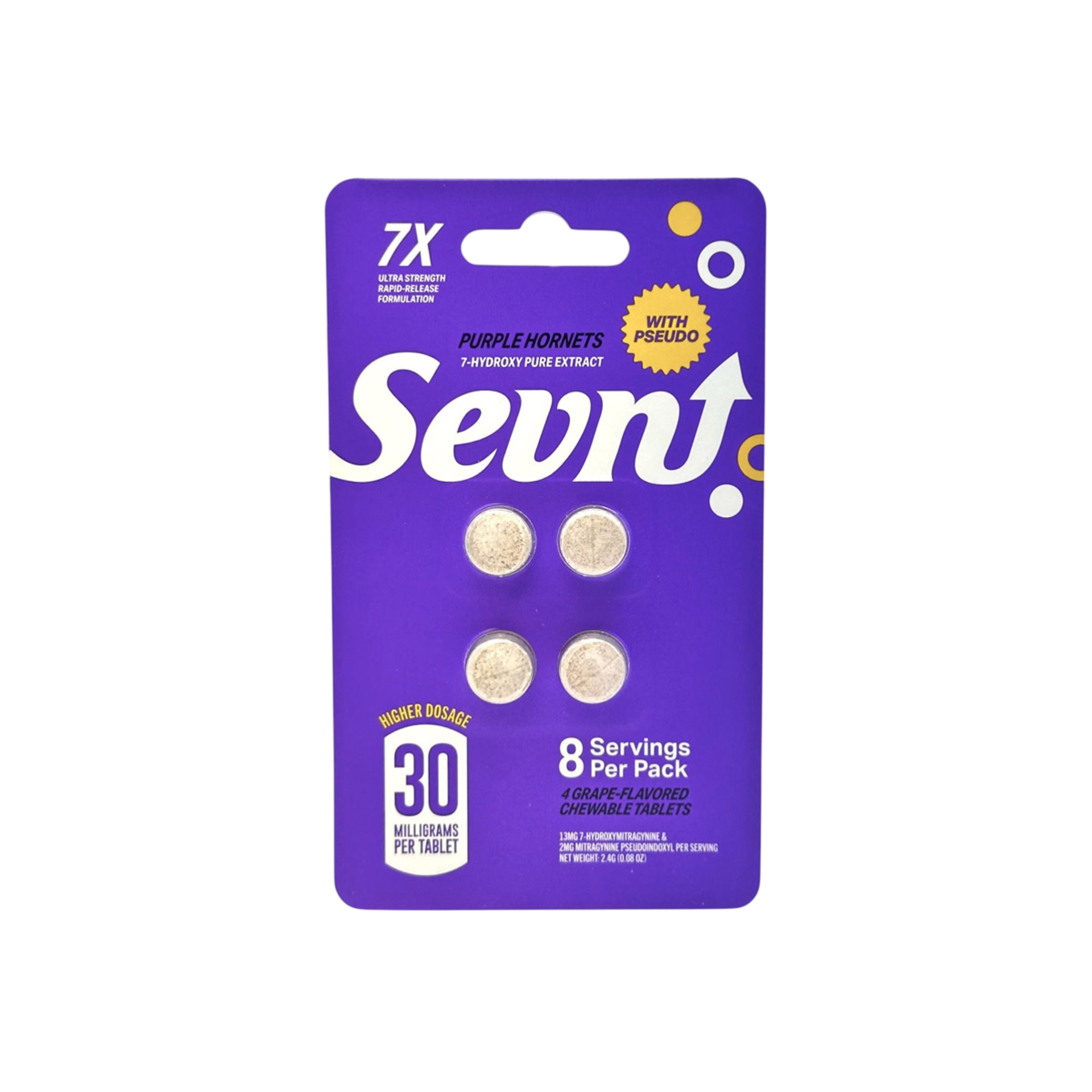 Sevn Purple Hornets tablets contained 21.41mg of combined 7-hydroxy and pseudo, which was about 29% weaker than its 30mg claim.