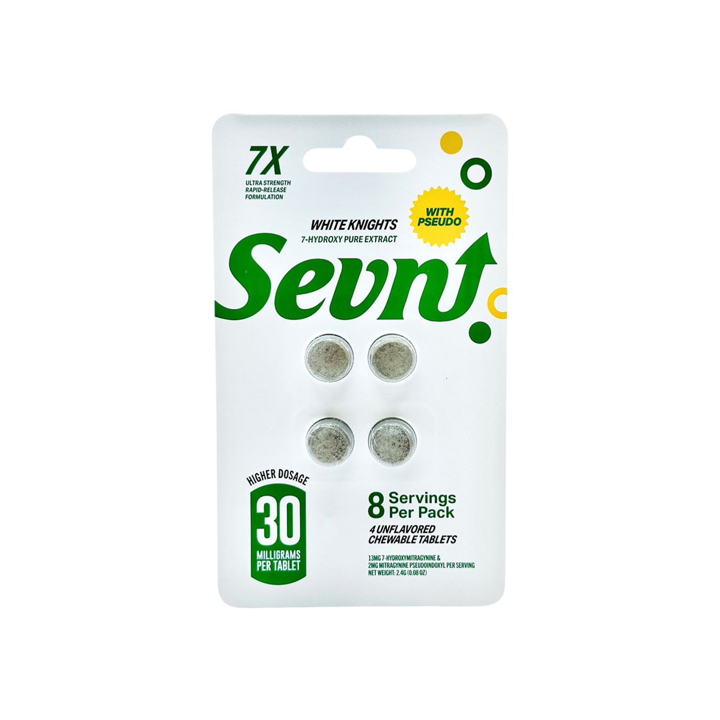 Sevn White Knights tablets contained 21.9mg of combined 7-hydroxy and pseudo, which was 27% weaker than its 30mg claim.