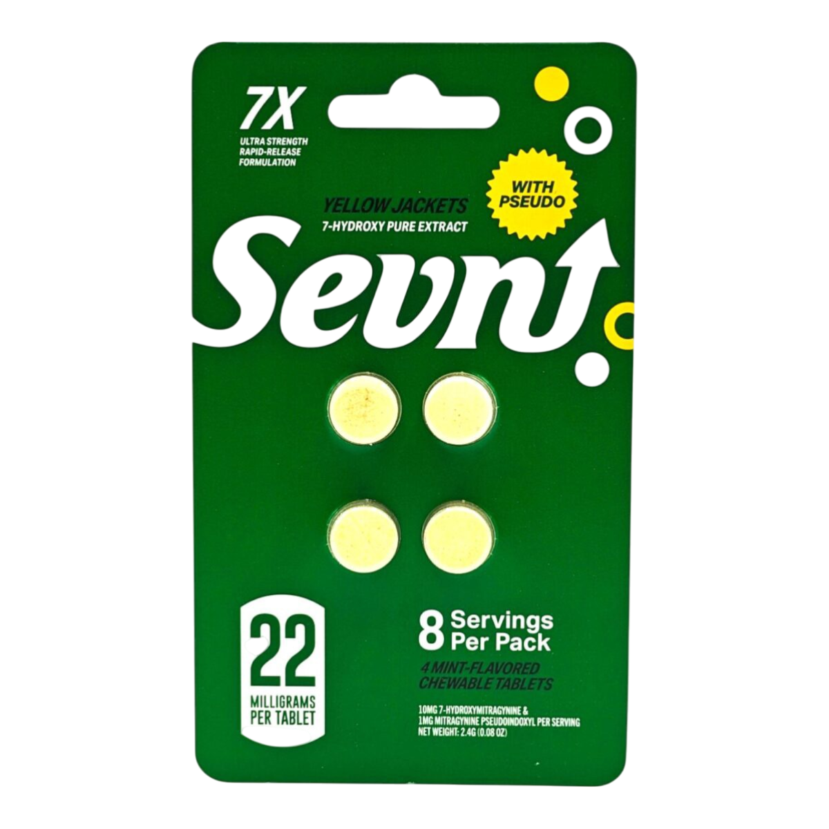 Sevn Mint Yellow Jacket tablets contained 15.30mg of combined 7-hydroxy and pseudo, which was about 30% weaker than its 22mg claim.